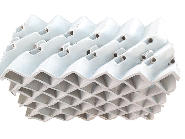 產品簡介:孔板波紋填料是在金屬薄板表面沖孔、軋制密紋,沖波紋后面會組裝